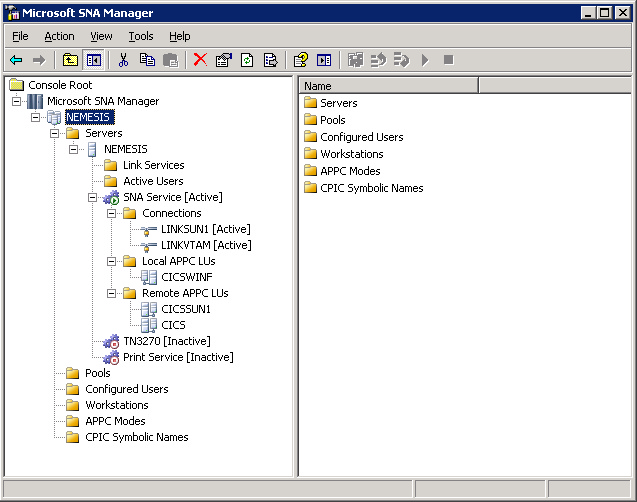 SNA node configuration SNA node must be configured and an active link to the partner system must be created. Of course, this link requires a correspondent definition in the VTAM of the partner system. Please refer to your Microsoft Host Integration server documentation to configure the node and the link, and refer to the corresponding documentation to define the node in the partner system (VTAM documentation for mainframes and SNA server product for other UNIX systems). Furthermore at least one LU to be used by the XCICS region must be defined. This LU should normally have the same name as the XCICS application name. XCICS identifies the LU by its alias therefore remember to correctly defined the alias too. The easiest way to configure the LU is to provide the same 8 byte identifer to the LU, to its alias and to the XCICS application name. Finally an alias identifying the remote partner must be added. XCICS configuration First of all, the LU alias for incoming and outgoing connections must be declared in xcics.conf. By default XCICS uses an LU alias equal to its name. Alternatively it is possible to override this behaviour specifing the default_inbound_lu and default_outbound_lu in xcics.conf. Then one or more connection entries (CCT) must defined using the define connection directive. A connection identifies the partner system, specifying the SYSID used in the application and the remote LU alias. Finally, sessions to serve incoming requestes must be defined, using the define sessions directive. Example configuration Following some example configuration describing a connection between an XCICS TS region and an IBM CICS TS on SNA over ethernet. Windows side In this example we defined: A) SNA Service, providing the SNA network and the CP names