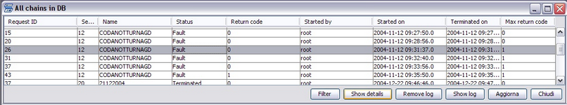 Chain logs The Chain logs window displays the summary of all the chains executed by XBM. This information may be filtered and/or sorted to simplify the access to the information.