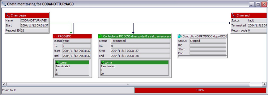 You may also get more details about the execution, displaying the chain log or the chain details. Chain details The chain detail window displays a graphical representation of the chain execution flow. It is show during chain execution, allowing a "live" chain flow monitoring, and from the chain logs windows, to analyze the flow of the chain when completed.