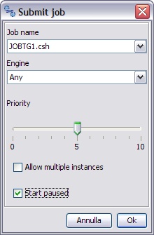 You may request a special engine to run your job, assign a particular priority or start the job in pause state. The Job name may be either a simple job name (i.e. JOB01.csh), that means the job must be searched in the XBM JOBPATH, or a full name referring exactly to the job you want to start (i.e. /home/jcl/MYJCL.csh or C:\JOBS\LIB1\MYJCL.csh). |