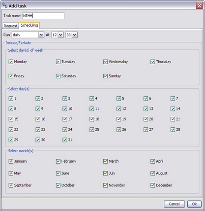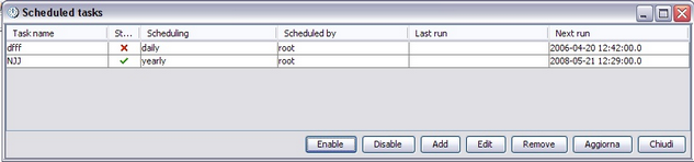 This window allow to edit, enable or disable tasks. Furthermor it shows the last and the next scheduled run for each task. Defining a task Each task is identified by: