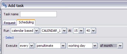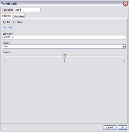 The task definition dialog allow the management of these information. The "Request" tab contains the information about the request to start (job/chain name, execution information, etc)