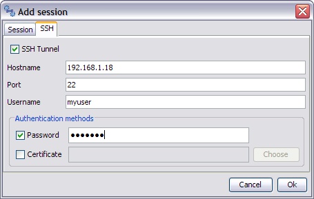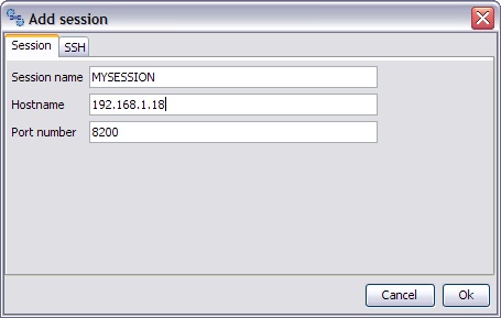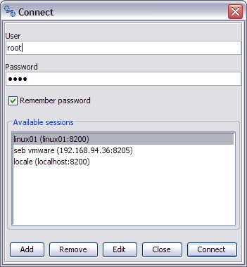To connect a predefined session, just enter username and password, select the session you want to attach and press "Connect". Session definition More than one session may be defined and managed. The session must contain: