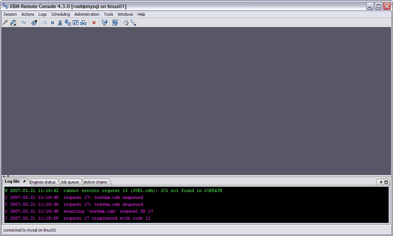 All the functions available in the remote console can be accessed trough the menu bar. The toolbar offers a shortcut for some of the most frequently used functions: a tooltip will explain the function for the selected icon. The monitors window At the bottom of the XBM Remote Console window, there is a tabbed area that contains some views to monitor the most important aspects of the connected XBM instance. Log file The log windows shows the central console log, since connected.