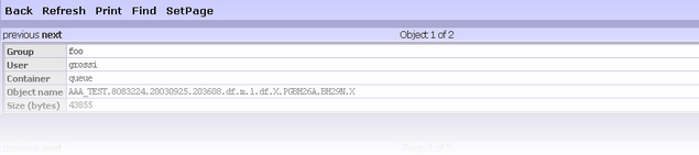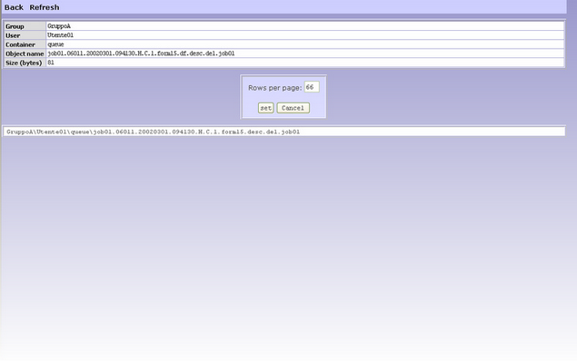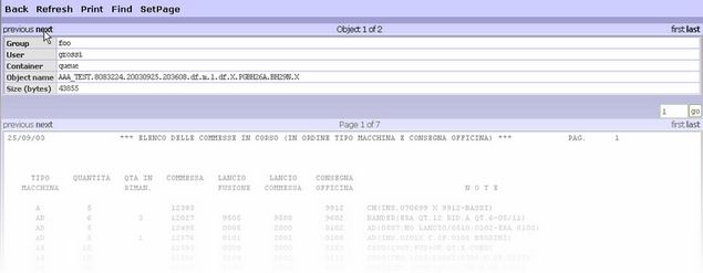 Except Refresh, all the functions demand the selection at least an object: such selection is obtained marking the case to the beginning of every line of the list. Show Function The show function displays the content of the objects. This page shows the name and location of the selected object and the its content. If more than one object are selected, over the name area, the navigation line appears to allows the access to the following file.