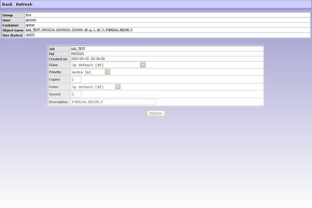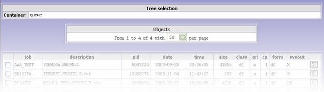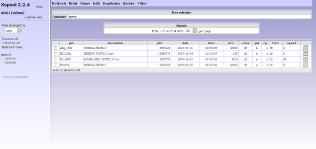 In order to organized tree structure there are three function. The command Expand All visualizes the entire tree structure. All directories and sub-directories are shown. The command Collapse All visualizes only the directories at highest level. The command Refresh tree reloads the tree structure. The User commands function loads the appropriate page to launch the executable programs defined into xspool.conf (for more details refer to User Commands ). Moreover the administrator (root user) can dynamically reload the XSPOOL configuration (xspool.conf) using the button at the bottom of the tree. Data frame This area, situated on the right hand of the page, contains the list of print files contained in the directory selected on tree area. For each file the following attributes are shown: