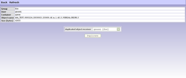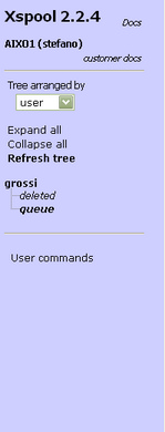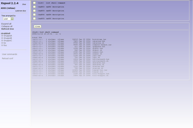 The Duplicate button executes the duplication. User Commands This functions shows the User Commands available for the current user, accordingly with the definitions provided in xspool.conf. For each command a button is shown. When the users pushes a button the corresponding command is activated on the server, and its execution output is displayed in lower side of the page.