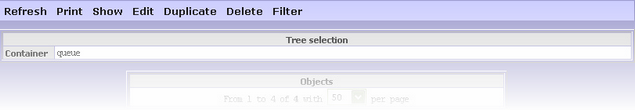 At the top of the page, there is menu of available functions. These functions change depending on the selected container or area of work. if "queue" directory is selected the following functions are available: