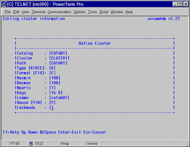 Validation of your choice, which takes place when the <ENTER> key is pressed, produces the display of the EDITING CLUSTER INFORMATION window: