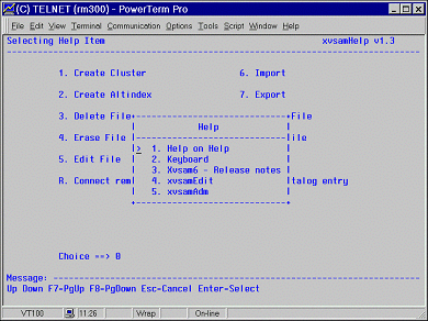 Different on-line help items can be chosen : 1. Help on Help general information about the using of HELP 2. Keyboard function keys meaning 3. Xvsam6 – Release notes release notice and technical information about XVSAM 4. xvsamEdit help about the xvsamEdit feature 5. xvsamAdm general information about xvsamAdm To choose an item, you should place the cursor >, by means of the Up and Down Arrow keys, in front of the wished item and then press the <ENTER> key. |